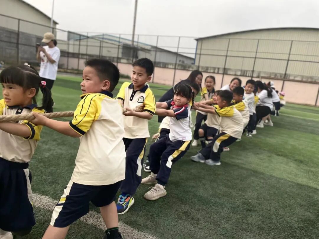 有趣好玩的拨河比赛开始啦,加油声和欢笑声在足球场中不停地回响,能与消防员叔叔近距离的互动,孩子们可激动啦!